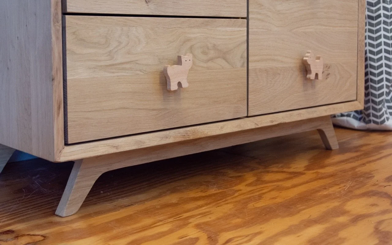 De lade-knopjes zijn gemaakt van lieve houten diertjes voor de kindertijd. Uiteraard zitten ze niet vastgelijmd maar geschroefd: want is je kind de dieren-knopjes ontgroeid? Met een paar andere mooie knoppen is de commode ineens een volwassen ladekast geworden. En wie weet worden de dieren-knopjes voor een volgende generatie nog eens tevoorschijn gehaald.