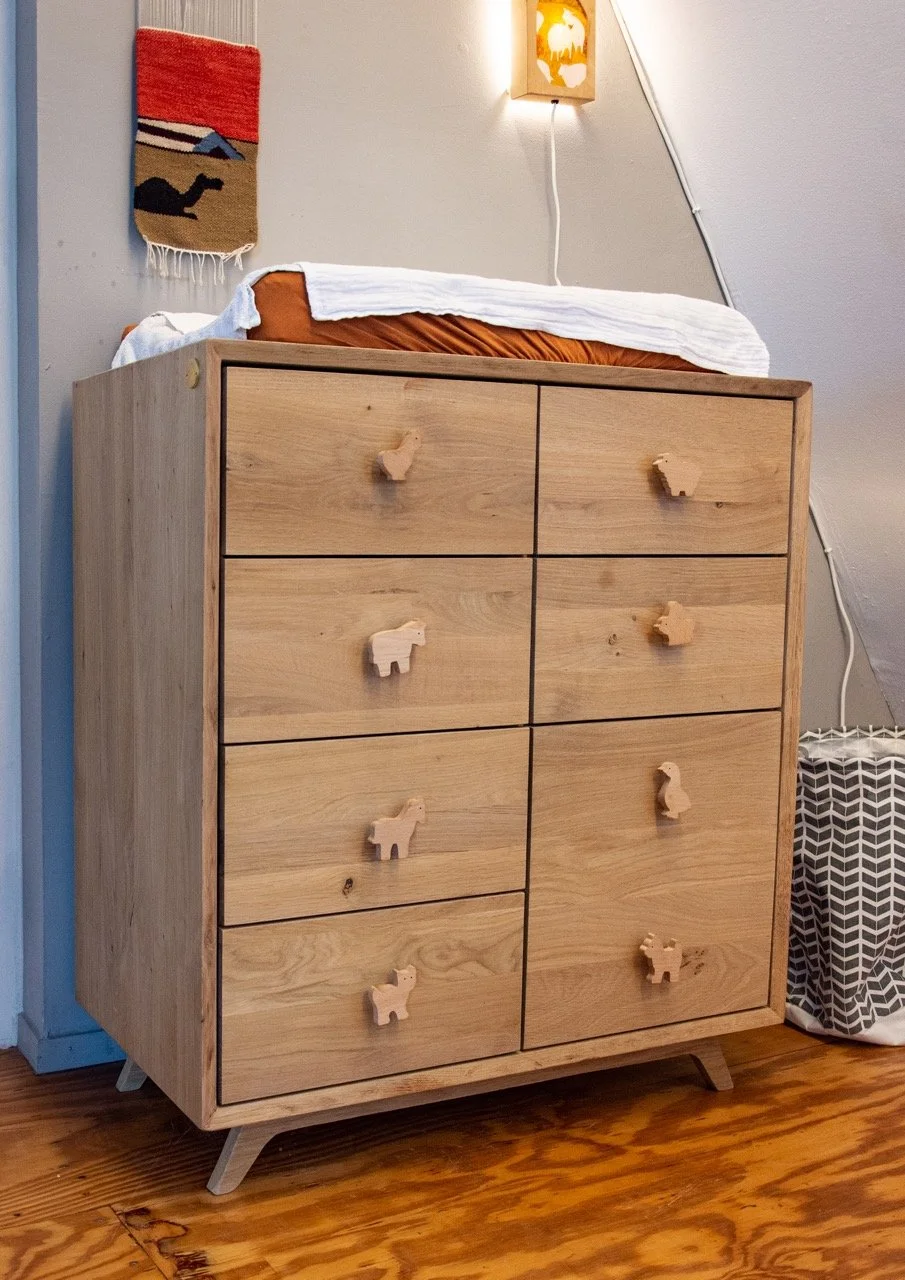 Deze stevige commode is van massief eikenhout. De lades zijn robuust en schuif je gewoon in en uit zonder kwetsbare schuifsystemen. De lade-knopjes zijn gemaakt van lieve houten diertjes voor de kindertijd.